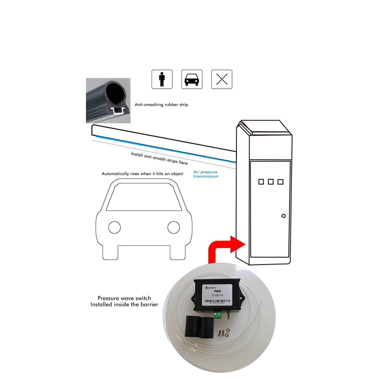 The PW30 Pressure Wave Switch Sensor is a mechanical pressure-based safety accessory specifically designed for traffic barrier gates and various door systems, providing dual protection against “crushing people and vehicles” by accurately detecting pressure changes. Compatible with a wide voltage range of 5-250V and featuring an ultra-fast response time of<10ms, this sensor works with anti-crushing rubber strips: when the barrier gate or door body comes into contact with obstacles (such as vehicles or pedestrians) and deforms under pressure, the sensor immediately triggers the barrier gate to rise back, eliminating safety accidents.